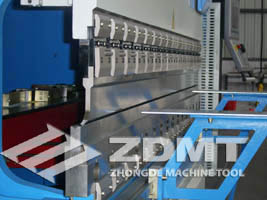 本系列液壓折彎機是雙缸上動式的數(shù)控液壓折彎機,它通過伺服比例閥上的各類閥門動作來驅(qū)動左右油缸的伸長與返回,從而帶動滑塊的上升與下降。滑塊的同步采用全閉環(huán)電液伺服控制技術,滑塊位置信號由兩側(cè)光柵尺反饋給數(shù)控系統(tǒng),再由數(shù)控系統(tǒng)控制同步閥的開口大小,自動調(diào)節(jié)油缸進油量的多少,從而控制滑塊(Y1、Y2)軸的同步運行,始終保持對工作臺的平行狀態(tài)。