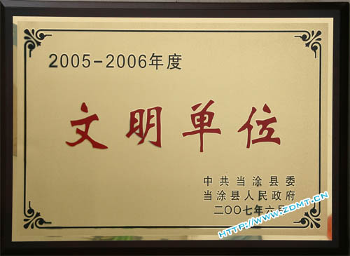 近日,我公司被中共當(dāng)涂縣委、當(dāng)涂縣人民政府聯(lián)合授予“當(dāng)涂縣2005-2006年度縣文明單位的”光榮稱號,這標(biāo)志著我公司在制度化、規(guī)范化、科學(xué)化管理方面邁上了一個新的臺階。近年來,我公司穩(wěn)抓精神文明建設(shè),努力為員工、社會營造健康、和諧的工作、生活環(huán)境,做到了物質(zhì)文明和精神文明建設(shè)雙豐收、雙促進。