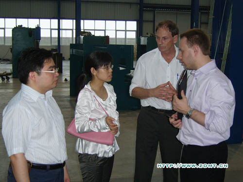 盡管天氣非常炎熱,下午還下起了暴雨,但這絲毫沒有影響他們參觀的熱情!稍作休息后,Peter和Daniel 就迫不及待的隨同公司領(lǐng)導(dǎo)及工作人員來到了我們的大型裝配車間,在這里,他們審視的眼光掃過每一臺機(jī)器,然后都滿意的點(diǎn)點(diǎn)頭。期間不斷的向隨行的工作人員提問,非常的認(rèn)真,我們的工作人員都耐心的一一解答。