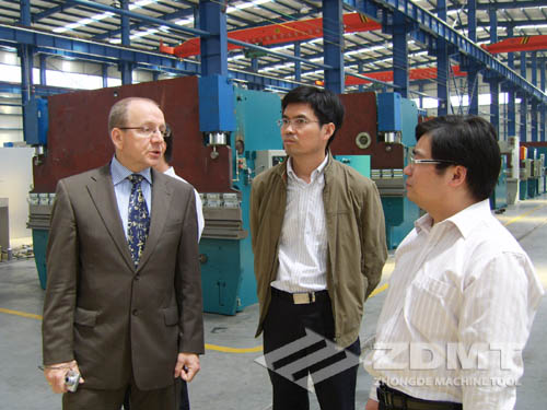 在整個的參觀過程里, EDWIN先生了解了我們先進(jìn)的工廠全程監(jiān)控系統(tǒng),寬敞明亮的工作車間以及外形簡潔優(yōu)雅的產(chǎn)品。相信在韓總流暢的英文翻譯下,EDWIN先生一行對本地區(qū)剪折行業(yè)的發(fā)展?jié)摿σ欢ㄓ辛诵碌恼J(rèn)識。同時,我們很感謝韓總和EDWIN先生,他們站在一個全新的角度,對中德機(jī)床提出了建設(shè)性的建議。我們也希望中德機(jī)床精益求精,同ESTUN公司和DELEM產(chǎn)品建立更緊密的關(guān)系,將中德機(jī)床推向更廣闊的市場。