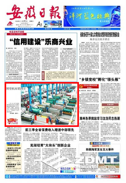 今日(2009年11月11日)《安徽日報》頭版刊載《博望機床銷四方》的圖片新聞報道。在我公司大型車間圖片中,配出如下文字報道:11月6日,位于當涂縣博望鎮(zhèn)的民營企業(yè)安徽中德機床股份有限公司生產車間里一片繁忙。該企業(yè)今年前三季度銷售量同比增長35%,產品出口30多個國家和地區(qū)。(特約攝影 謝富樂)